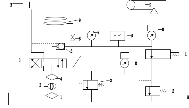 13、溢流閥 14、油箱 15、接緊油缸 16、壓力變送器 17、張緊小車